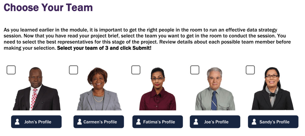 Learners were then provided with the opportunity to work through a scenario. The scenario had them selecting their team for a data strategy session. Learners can can get more information about each potential participant and select 3 participants for the session.