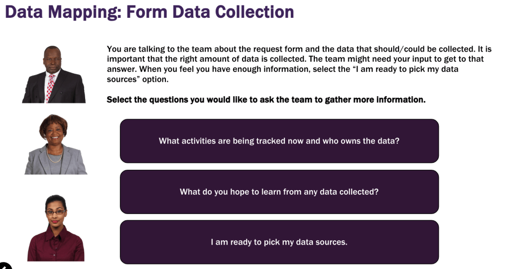 | Scenarios | Learners are given scenarios to practice their interviewing skills and work through collecting information for their data strategy. Learners are also provided with a mock interview scenario with key stakeholders to ask questions and dig into details for the given problem. This scenario allows the learner to practice selecting the right questions in a safe environment with feedback provided. |