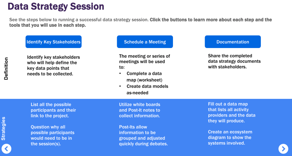 | Case Studies | A completed project and allows learners to deconstruct a project to review how selections were made. Interactive elements in Storyline will allow learners to develop their data strategy using common techniques for strategy facilitation. The case study allows the learner to see how a data strategy was put together and reverse engineer the process before they try it themselves. |