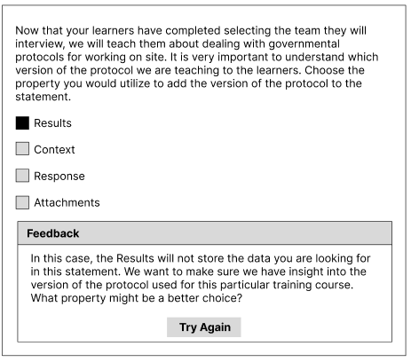 Once the learner understands the properties, they are guided through a scenario where they will decide what properties they will use based on teh desired outcome. The branched scenario was used to give a real-world example and help the learners put everything they have learned to use. Feedback is given for each section to ensure the learner understand why a certain answer might be better than another.