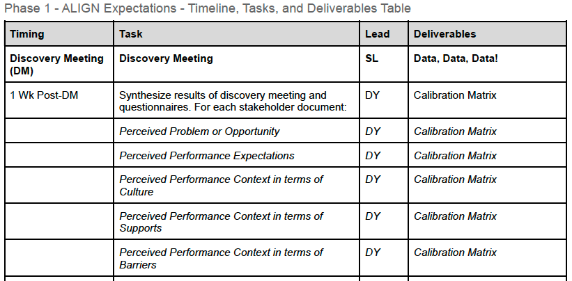 One critical piece of information was an agreed-upon understanding of what success looks like for this project from an organizational and human performance perspective. We needed to make sure any outcomes were repeatable for future programs. We then mapped the described performance problems throughout the organization and identified the alignment level of the work request. Our plan identified relevant results, metrics, and performance targets. We also plan to estimate the gaps in outcomes, compare current performance with desired performance, and assess performance context. We will identify the current level of results. We also plan to depict relationships between organizational goals, strategic priorities, and stakeholder expectations and collaboratively design a data collection strategy. Our plan for this included all tasks, meetings, and deliverables that would be expected from our team and the client team.
